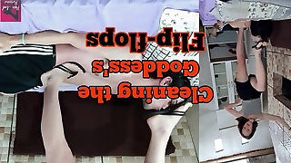 Wife ravaged rock hard with tongue while washing dishes in the kitchen, getting her to cum before her stepmother gets home.