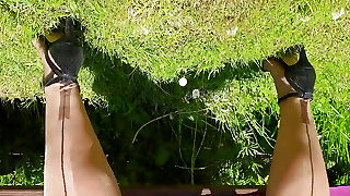 Hot housewife suspends her stilettos and teases her sheer nylon gams