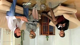 Sexy bosses turn office perv into nylon foot worship gimp