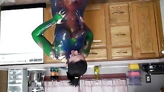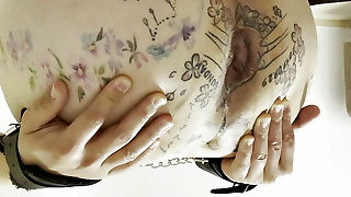 Super-naughty slut strips off underwear and gets messy on floor with assets paints