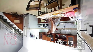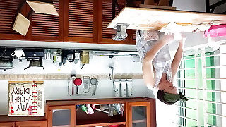 Ravioli Time! A naked housekeeper works in the motel kitchen. Depraved housekeeper works in the kitchen without underpants.